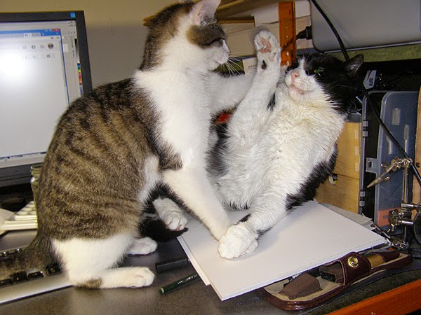 Ale w pewnym momencie z łóżeczka wylazł jeden kotek i usiadł przed monitorem… dziwnym trafem na klawiaturce i zrobił „kscnkauybgfuhfhfhwkrg”. A potem przyszedł drugi kotek i przemaszerował przez klawiaturkę kasując niezapisany scenariusz do komiksu i zastępując własnym dziełem literackim, nieporównanie lepszym.