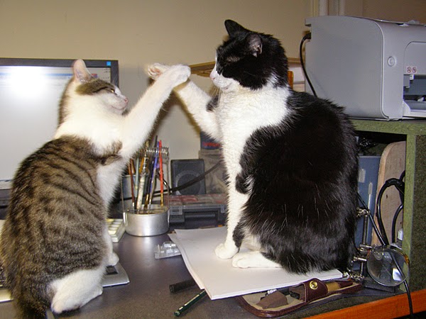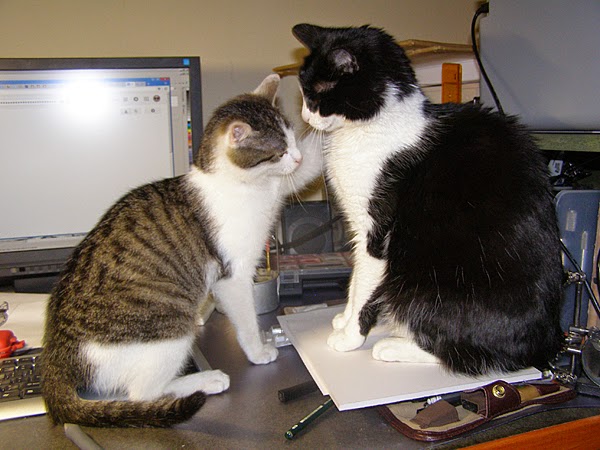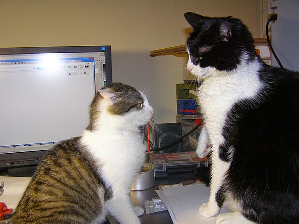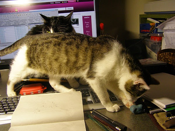 Ale w pewnym momencie z łóżeczka wylazł jeden kotek i usiadł przed monitorem… dziwnym trafem na klawiaturce i zrobił „kscnkauybgfuhfhfhwkrg”. A potem przyszedł drugi kotek i przemaszerował przez klawiaturkę kasując niezapisany scenariusz do komiksu i zastępując własnym dziełem literackim, nieporównanie lepszym.